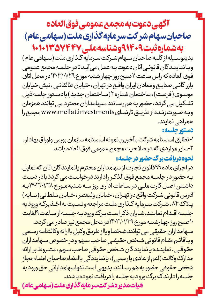 بدینوسیله از کلیه صاحبان سهام شرکت سرمایه گذاری ملت (سهامی عام) و یا نمایندگان قانونی آنان دعوت به عمل می آید تا در جلسه مجمع عمومی فوق العاده که راس ساعت ۱۱ صبح روز چهار شنبه مورخ ۱۴۰۲/۰۹/۳۰ در محل اتاق بازرگانی صنایع و معادن ایران واقع در تهران، خیابان طالقانی، نبش خیابان موسوی(فرصت)، ساختمان شماره ۲ (ساختمان جدید ) با دستور جلسه ذیل تشکیل میگردد، حضور به هم رسانند.